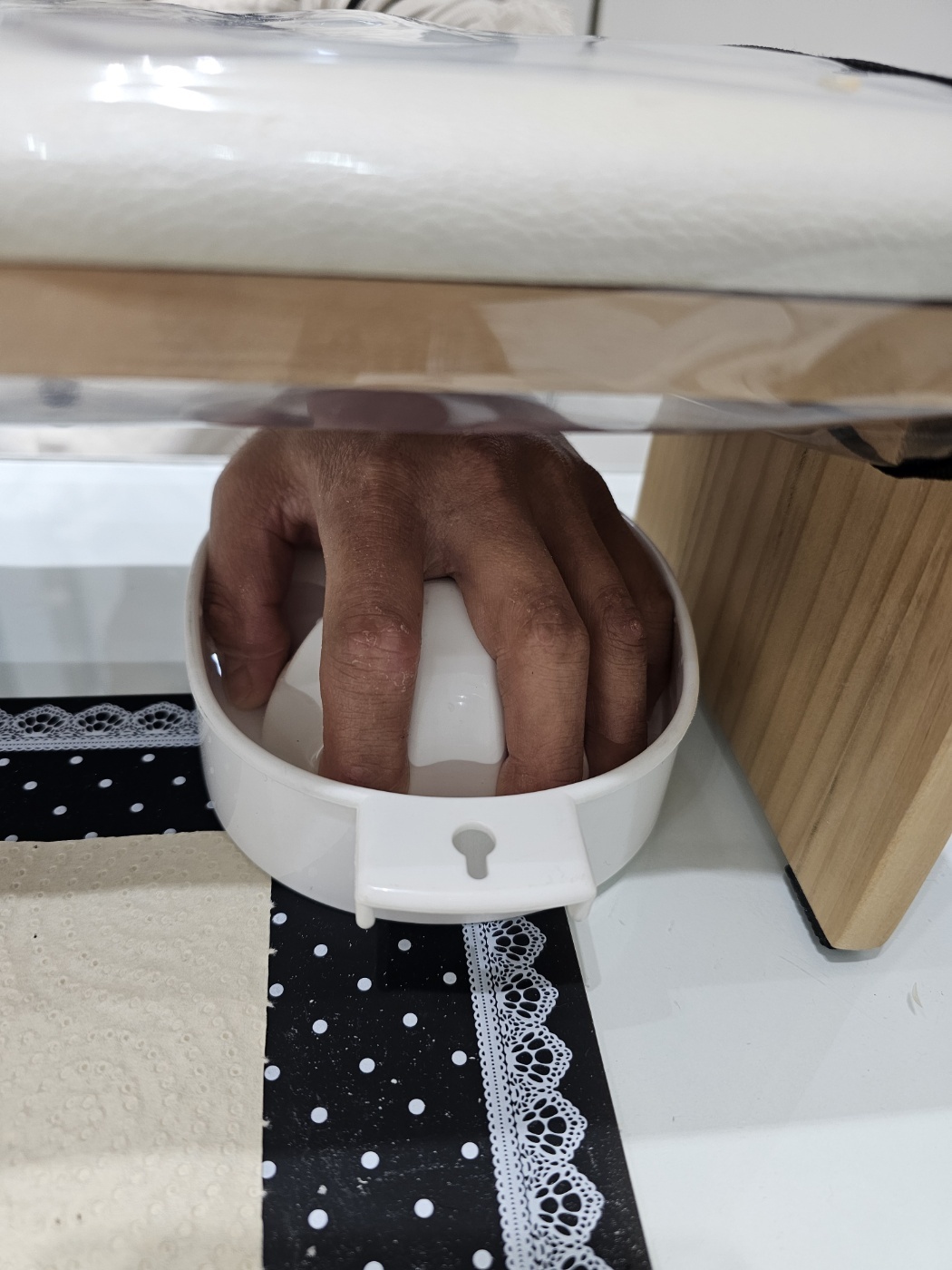우리가 사우나가게 되면 따뜻한 물에 몸을 담그듯이 손가락을 흰 통 안에 따뜻한 물에 담그고, 손가락을 넣어 뿔리고 있는 중입니다.