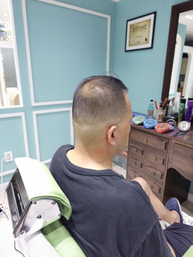 짧고, 깔끔한 스타일을 위하여 페이드 커트를 진행하였고, 제품을 바르지 않아도 관리가 편한 스타일 중 하나입니다.